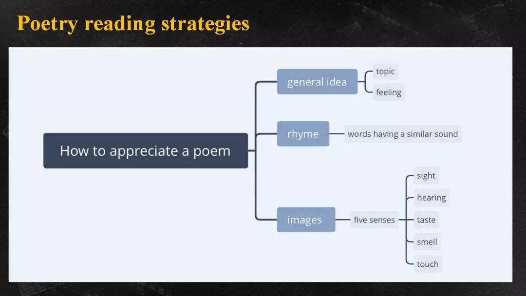 这堂课的设计很精妙,从复习My Dad到赏析诗歌Never a Dull Moment,老师带着学生完成了三个教学任务:1.欣赏诗歌三步走;2. 选配乐并朗读;3. 一次中文古诗和英文诗歌的碰撞。