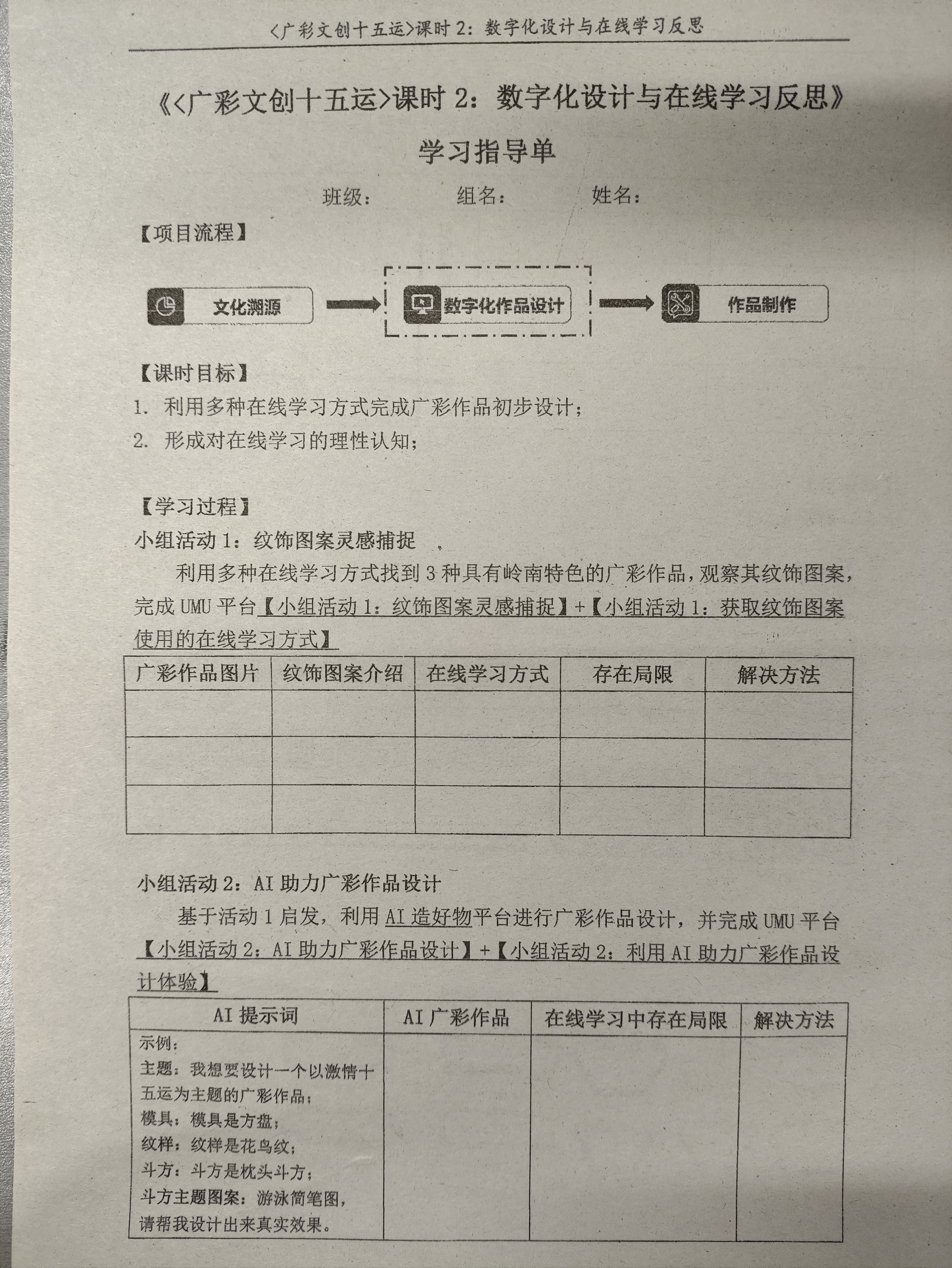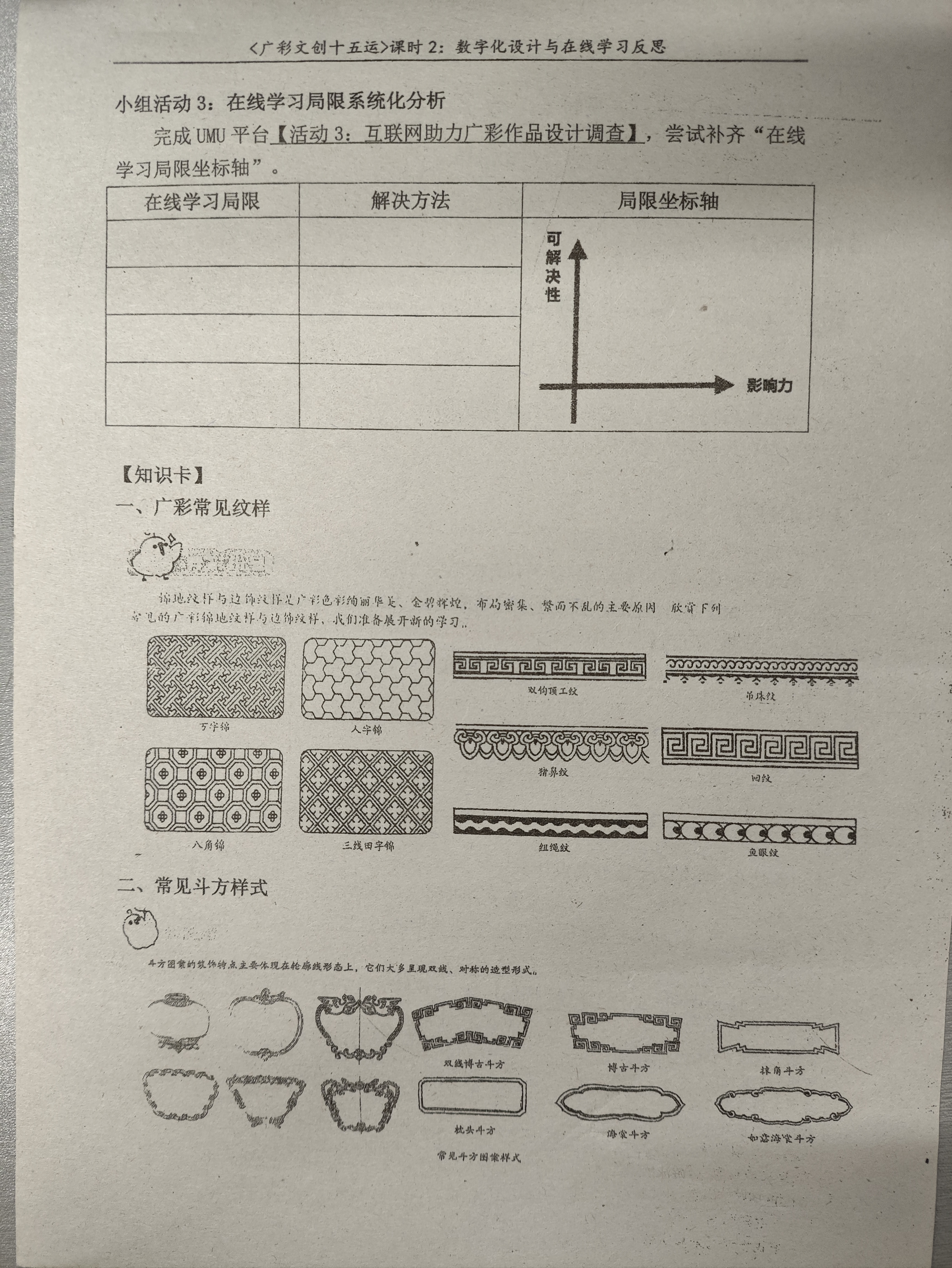 | 本学期第17周区教研到广州市第二十六中学听了薛老师的1节信息科技课,这节课选自国家信息科技课程七年级信息科技内容《互联网应用与创新》,薛老师将课程内容与学校作为非遗传承基地联系起来,设计了《广彩文创十五运》跨学科课程,分2个课时授课,第1课时利用互联网让学生对广彩的历史与制作流程进行初步的了解,对在线学习方式进行体验与评价,第2课时进行广彩作品的初步设计,我听的是第2课时。 本节课薛老师主要引导学生利用在线学习的方式完成两个递进的任务“纹饰图案灵感捕捉——广彩作品数字化设计”,让学生深刻感受技术赋能与文化表达的冲突,并利用“在线学习局限坐标轴”让学生感知网络学习的局限,培养学生的批判性工具使用观和问题解决意识,完成“推动非遗数字化,但需坚守文化内核”的价值观。 薛老师本节课的四大亮点: 1、利用项目“广彩文创十五运”,构建真实情景下的非遗传承问题,引导学生经历“文化溯源——数字设计——劳动实践”的完整项目链,有效实现在做中学,促进文化传承和学生的科技创新意识。 2、通过三个递进式的任务“纹饰图案灵感捕捉——广彩作品数字化设计——在线学习局限坐标轴绘制”,将在线学习的典型局限转化为具体的问题情景,引导学生在完成任务的过程中经历“发现问题——分析偏差——尝试修正”的完整探究链条。 3、合作探究,发挥集体力量。任务开展过程中引导学生发挥合作互助的精神,削减非遗作品设计和在线学习的难度,在实践中加深学生对在线学习的认知。 4、采用UMU线上平台,线上线下教学相结合。课堂上还推荐学生使用AI造好物平台,让学生了解用人工智能技术快速设计作品的方法。 薛老师通过UMU平台及时呈现了学生在线学习遇到的各种问题,向同学们展示在线学习的优缺点及解决方法,本节课的精心设计,即让学生完成了在线学习的理性认知,又通过一系列的课堂活动让学生设计了1份广彩作品。 在实际的授课过程中,在线学习地局限和改进方法、在线学习局限坐标轴虽有交流探讨,但在黑板上地呈现不够完整,建议及时感知学生的表达欲望,顾及到全班同学,并且做好板书,让课堂内容更好地更清晰地呈现在黑板上。  |