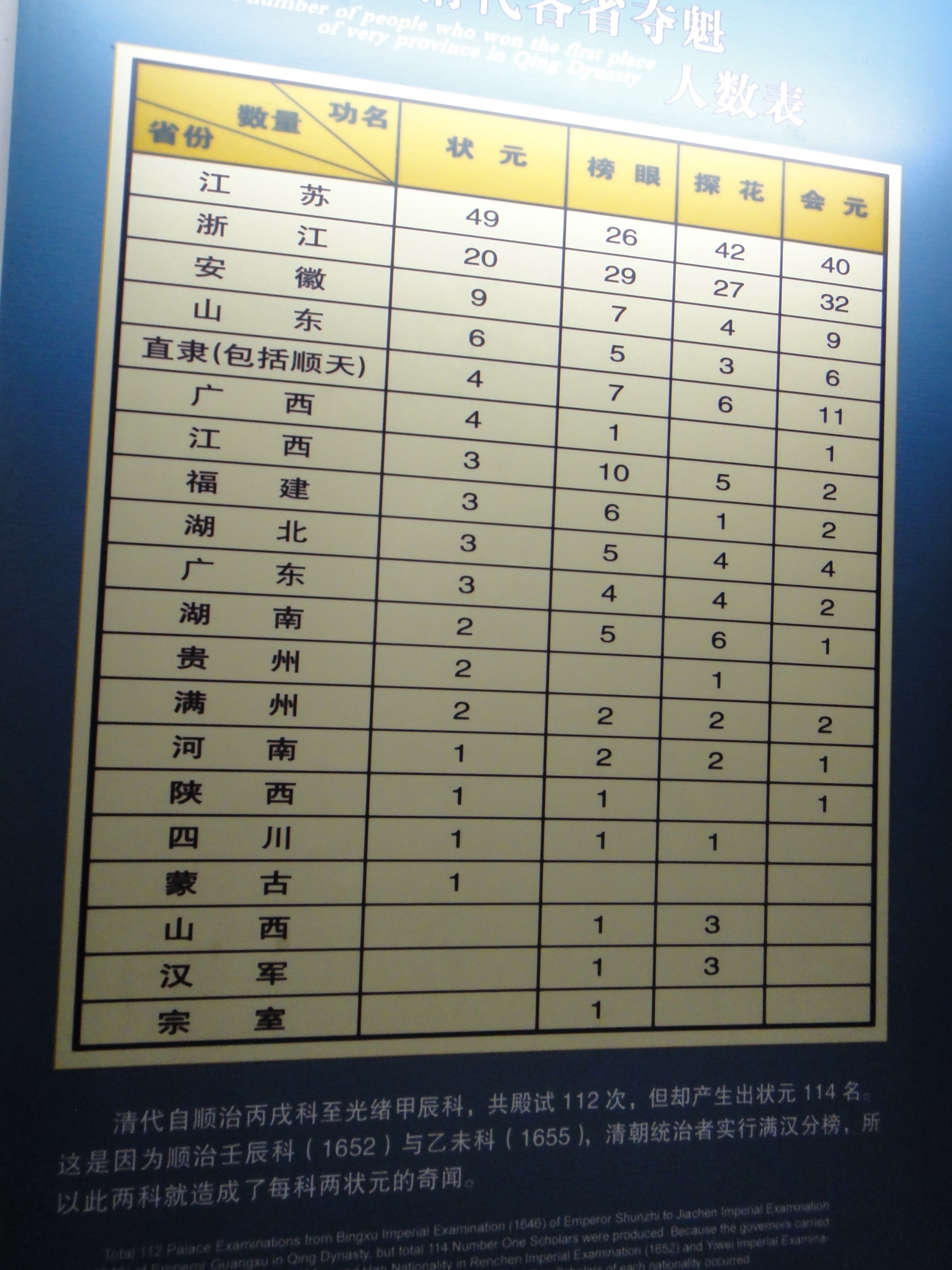 2,有清一朝,举行殿试112次,产生状元114人(有2次专设满人榜)。其中籍贯江苏者49人,占全国43%。加之浙江,达61%。这数据,你不佩服还不行。