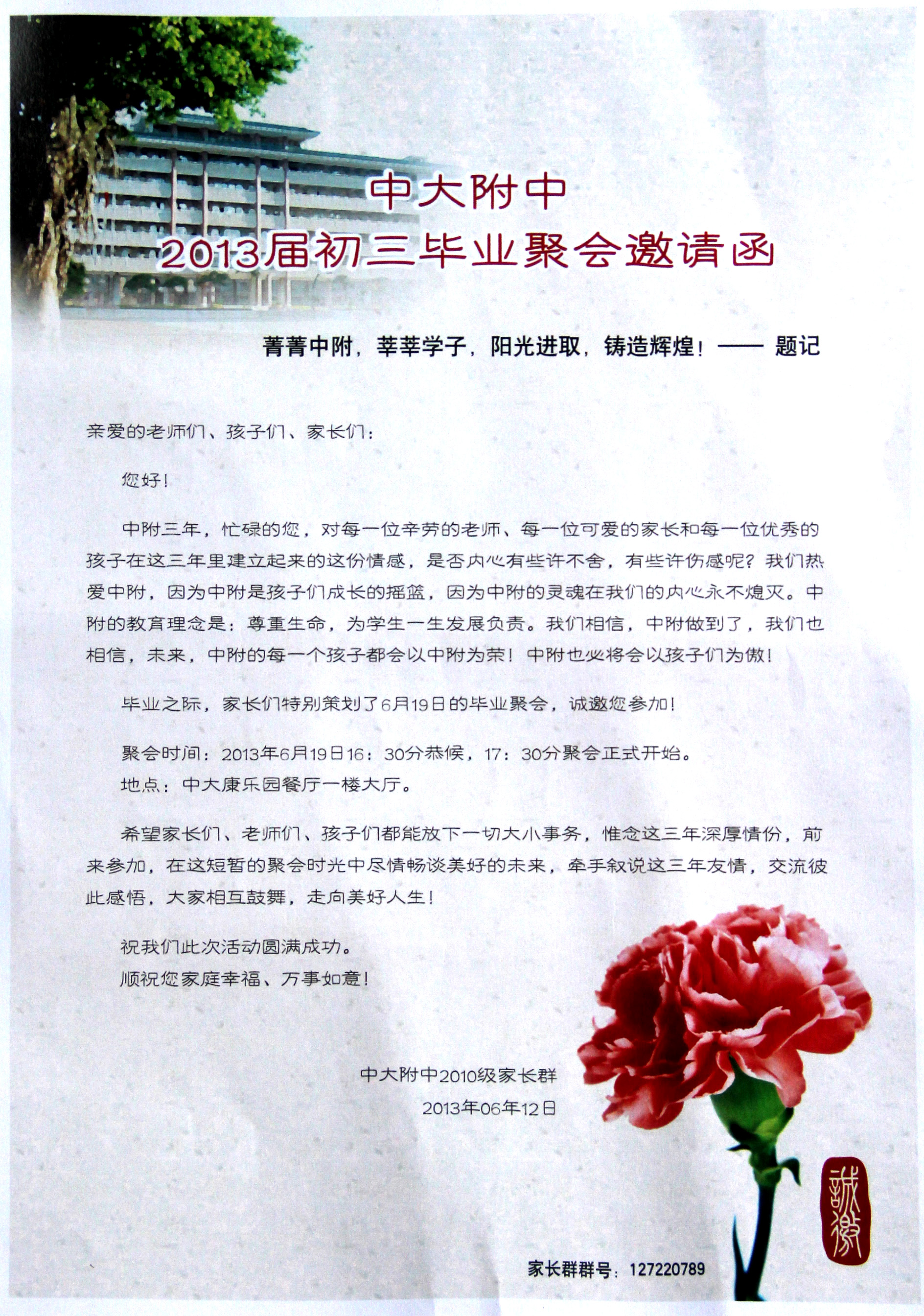 希望家长们、老师们、孩子们都能放下一切大小事务,惟念这三年深厚情份,前来参加,在这短暂的聚会时光中尽情畅谈美好的未来,牵手叙说这三年友情,交流彼此感悟,大家相互鼓舞,走向美好人生!