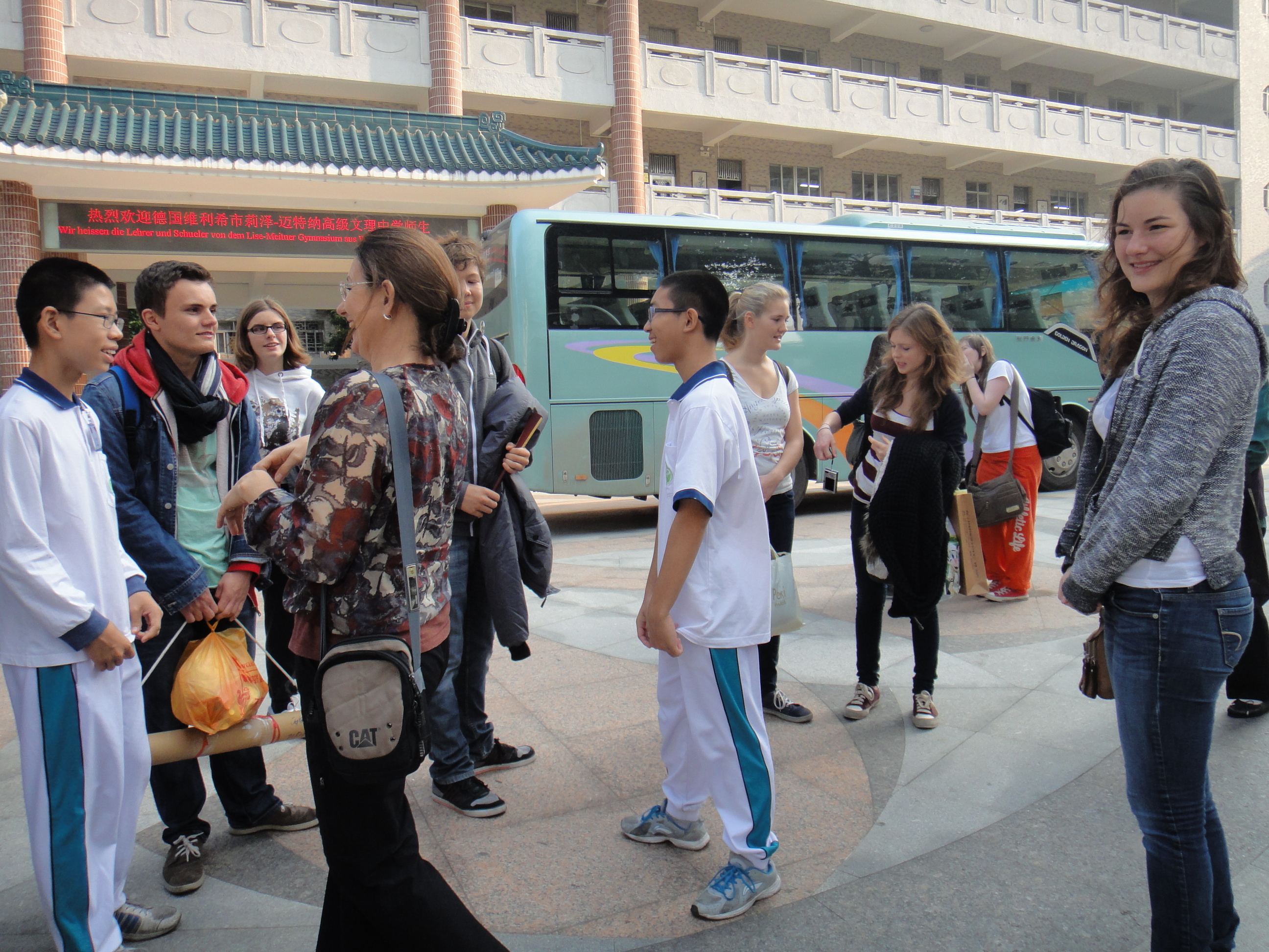 她们走进我们的课堂,英语课,共同答疑解题,罗老师把课堂弄得笑语连连,生生互动;冯老师教他们学中文,费了很多功夫备课,很有新意。体育课堂,学中国功夫,提毽子,学“中附风”,兴趣满满。在看到我们学生,会二胡又会小提琴,他们说,中国的东西你们会,西方的你们也会?我们的美术老师,一笔下去就是个游虾;随笔一转,就是熊猫,活灵活现,她们惊叹。我们的音乐老师全用英语教学,连我们也意外。她弹古筝,使琵琶,会钢琴,德国师生很敬佩。