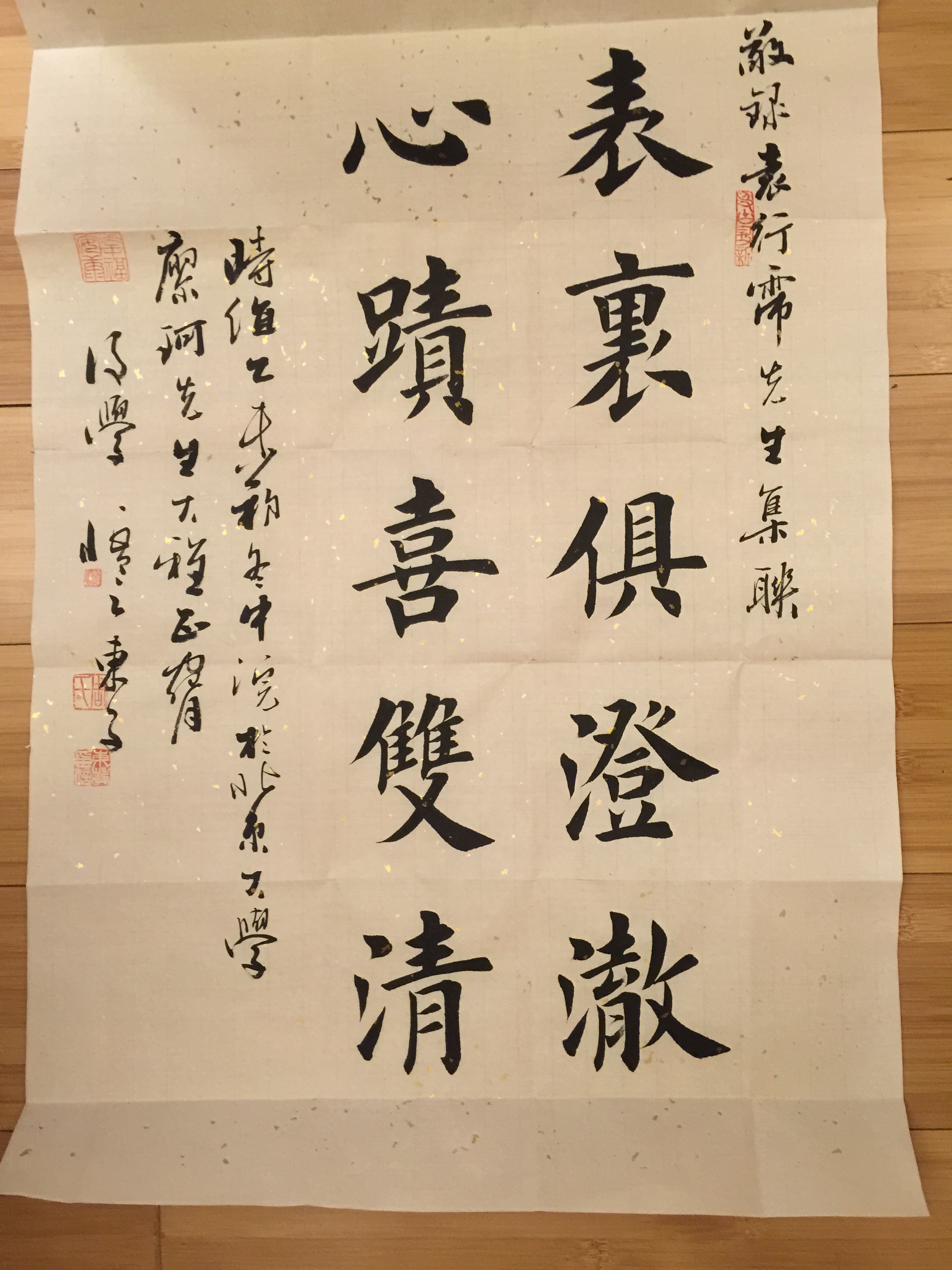 她送我作品两幅,一是“怀瑾握瑜”,一是“表里俱澄澈、心迹喜双清”(国家文史馆馆长袁行霈句)。俱为险峻挺拔的欧体风格,清雅而秀丽,端正且错落。多日放在手头把玩不止。