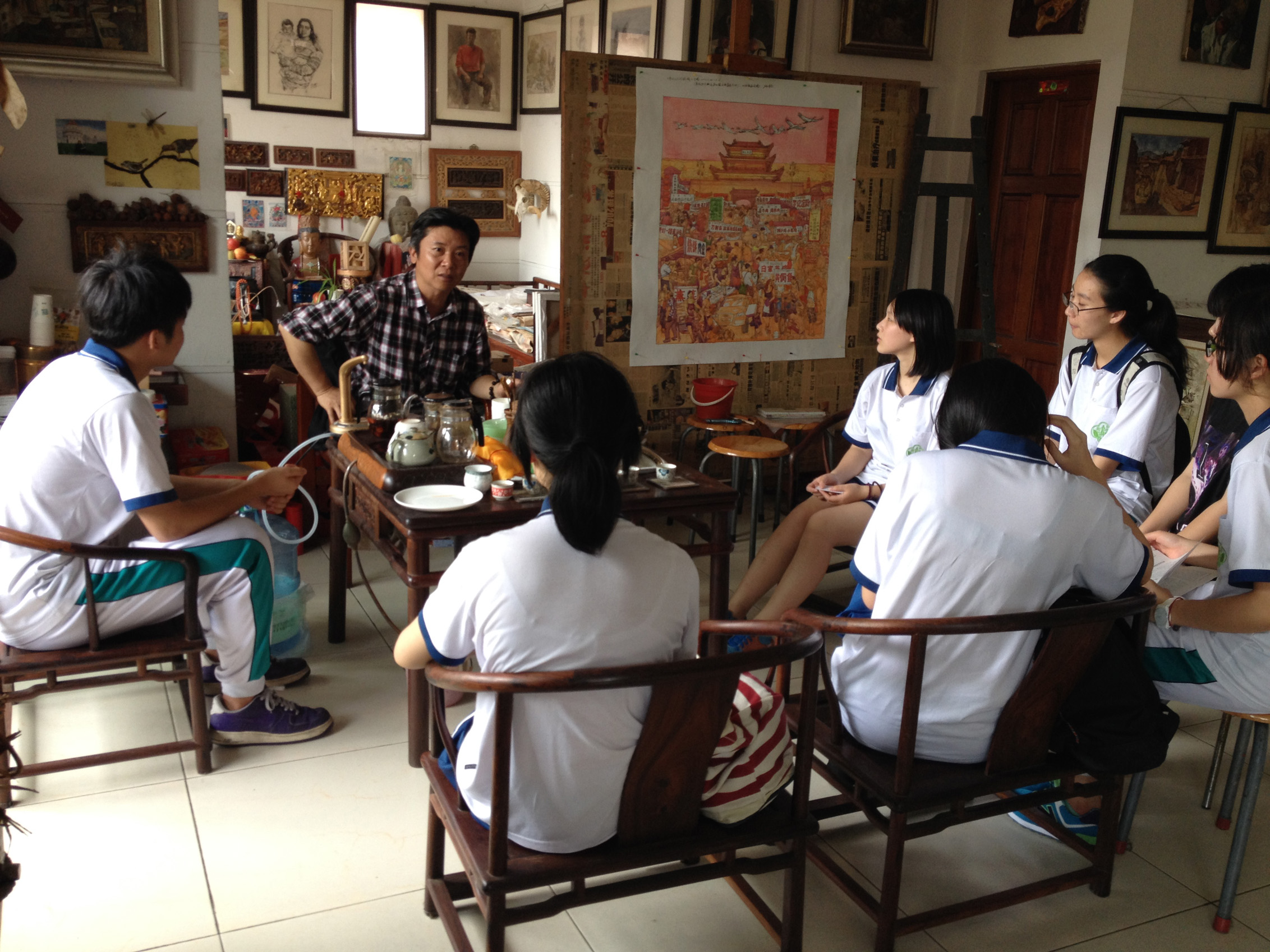 画室里还有很多有趣的收藏和摆设,引起了同学们的兴趣,大家围着孙老师问这问那,不知不觉中,在师牛堂和孙教授度过了一个难忘的下午。