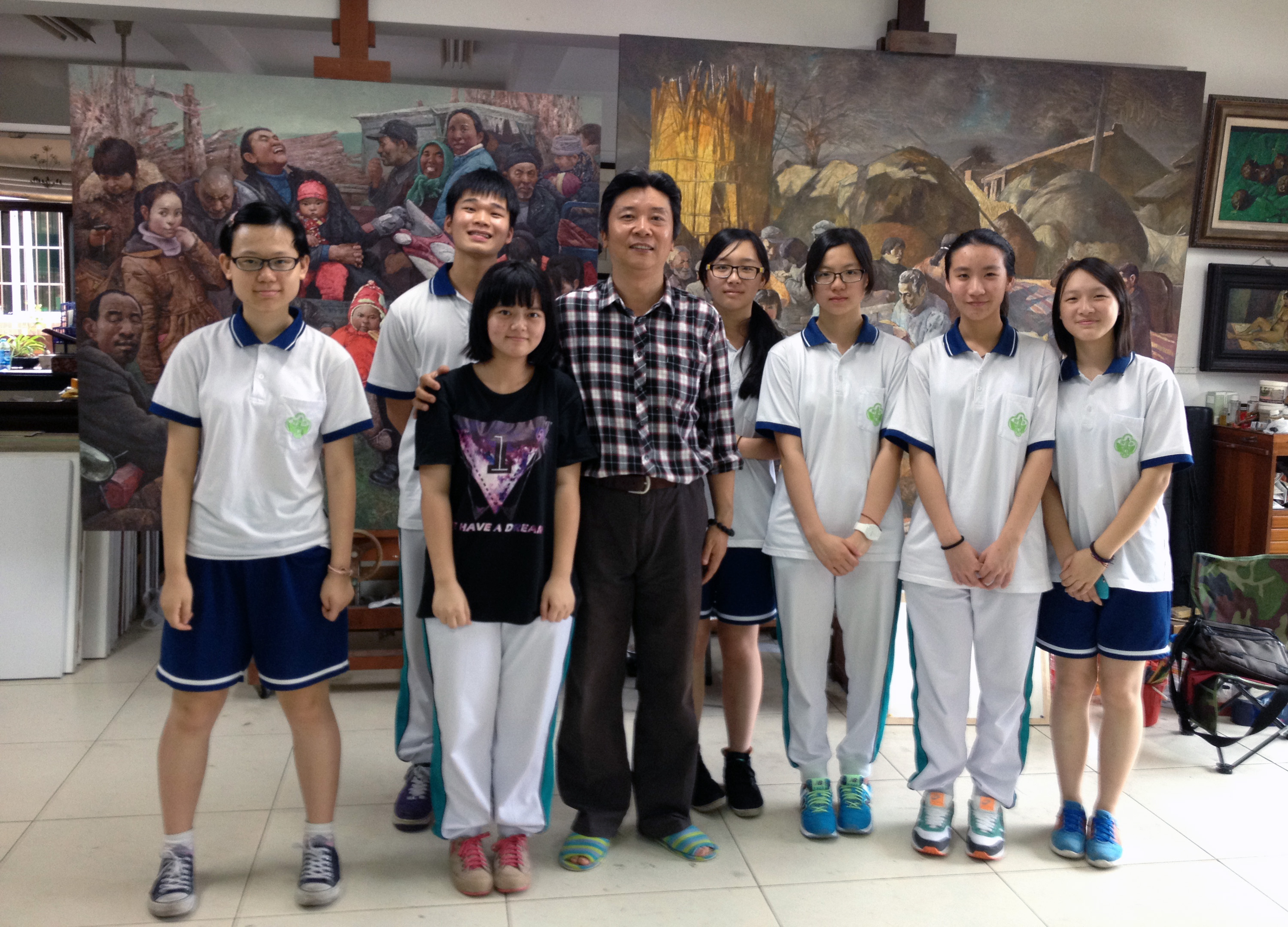 健谈的孙教授从自己的成长、工作、创作聊起,他是河南人,16岁就如愿考上了广州美院,毕业后回乡工作,后来又回广美深造,虽然最后留在广州工作,从一个农村孩子成长为著名画家,但他始终对家乡怀有深深的眷恋,因此,家乡的生活成为他创作的主要题材。看满屋的画作,都是表现中原农村的生活。他走到其中的两幅画前,仔细地给同学们讲解创作的缘由、思想、技法、过程等,与大家分享其中的辛苦和快乐。有同学问孙老师说,你每天画画,不觉得辛苦吗?他笑着说:干自己喜欢的是一点儿都不觉着苦和累。我能有今天的收获,并不是我很聪明能干,也不是运气好,主要在于我坚持不懈。人们常说,成功在于坚持和执着,道理很简单,但不是每个人都能做到。表现我熟悉的生活,做我喜欢做的事,我坚持下来。他告诉同学们,每个人从小就要有理想,有追求,专注做好一件事,就一定会成功。