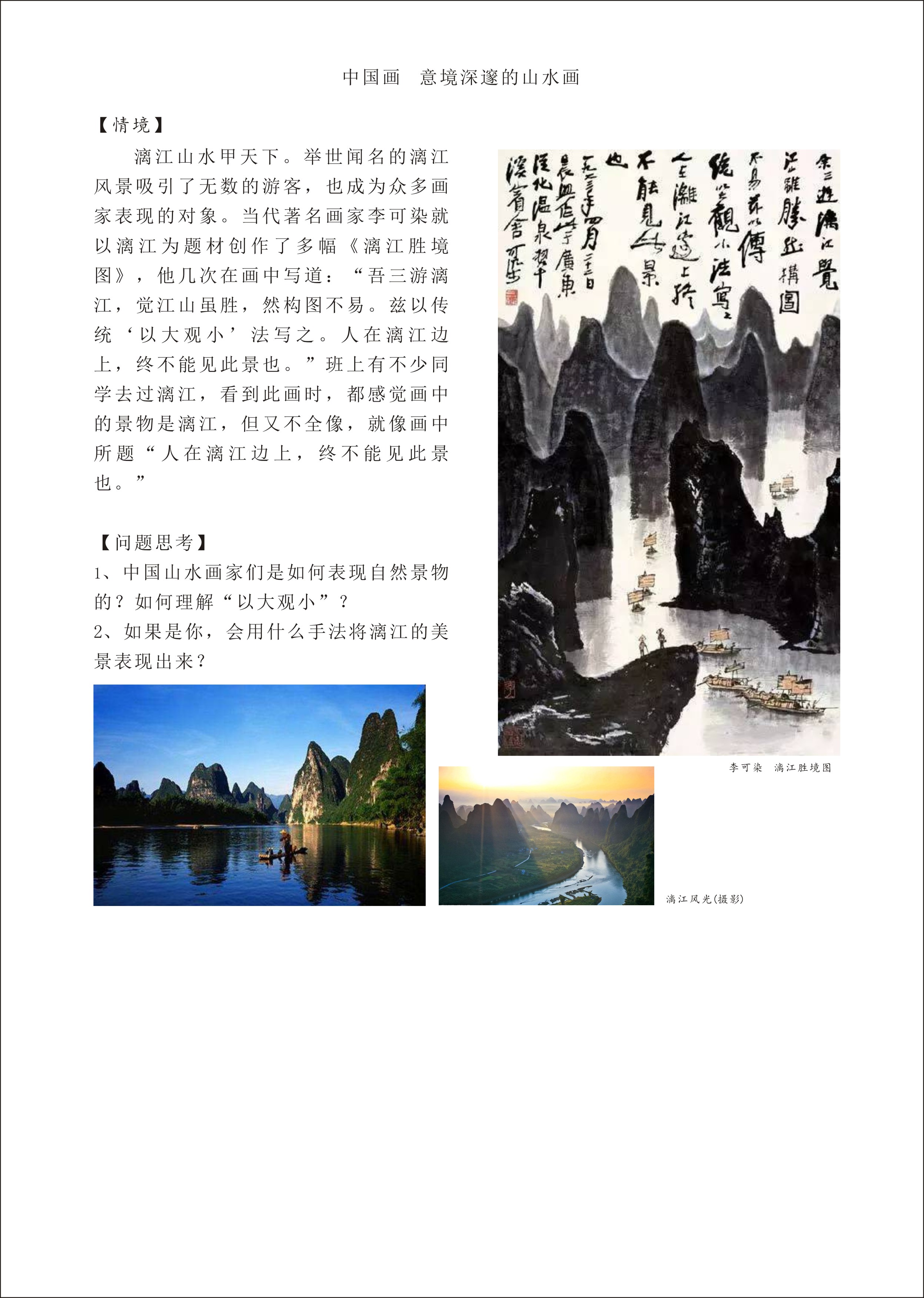 漓江山水甲天下。举世闻名的漓江风景吸引了无数的游客,也成为众多画家争相表现的对象。当代著名画家李可染就以漓江为题材创作了多幅《漓江胜境图》,他几次在画中写道:“吾三游漓江,觉江山虽胜,然构图不易。兹以传统‘以大观小’法写之。人在漓江边上,终不能见此景也。”班上有不少同学去过漓江,看到此画时,都感觉画中的景物是漓江,但又不全像,就像画中所题“人在漓江边上,终不能见此景也。”