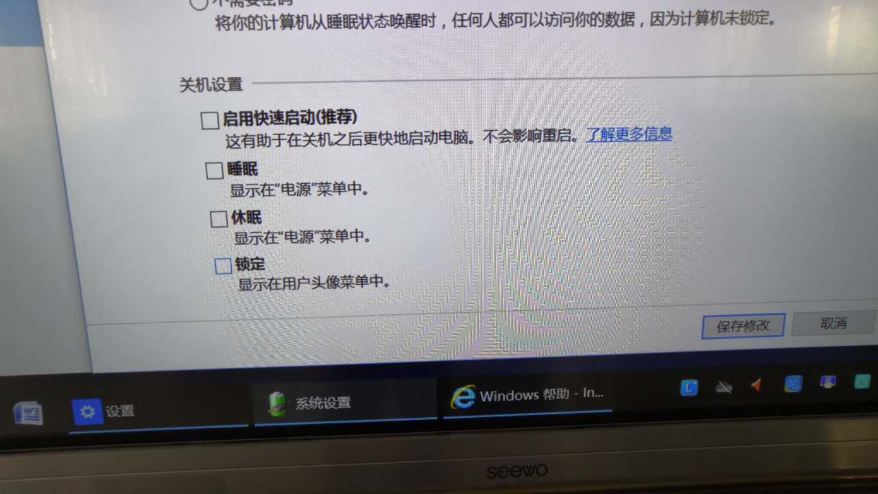 这时即可选择更改设置了,我们可以把“启用快速启动(推荐)”前的框框勾选点击后取消选择,然后再点右下角“保存修改”,就完成了电源管理的设置了。